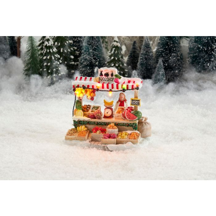 Friske varer, dyrket lokalt lyser op i de skønneste farver. Den populære madbod kan byde på lækre frugter og grøntsager. Alt bliver vejet til den helt rigtige pris på den store, gamle vægt. Boden er pyntet med lyskæde med kulørte pærer.