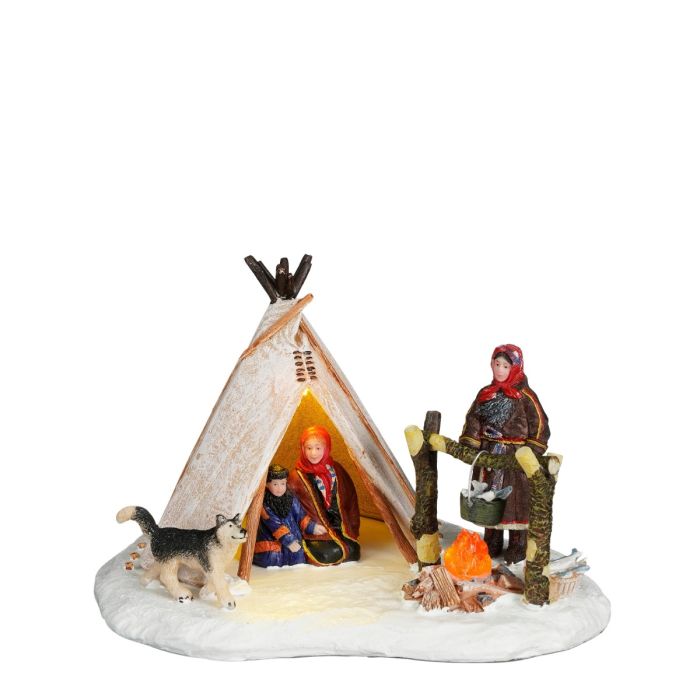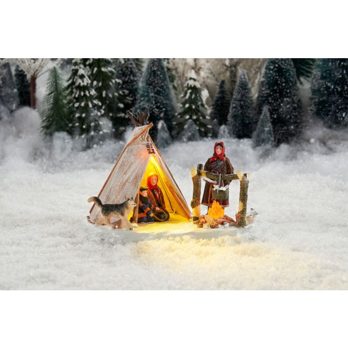 Mens børnene varmer sig i teltet, står mor og tilbereder lækker mad over bålet. Mon hunden håber på en smagsprøve? Der er lys i teltet og i bålets flammer.