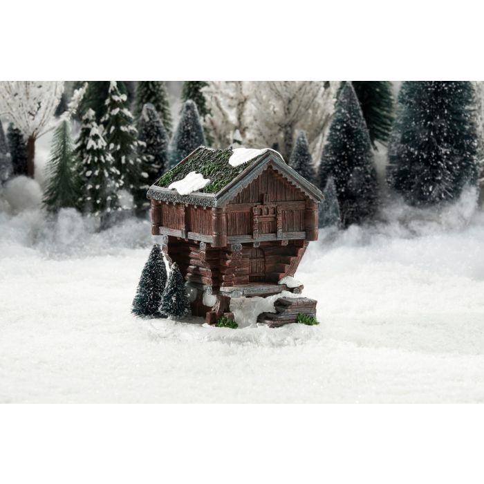 Solidt bygget af store træbjælker ligger denne meget lille træhytte godt i skovbrynet. Sneen er faldet, men lidt grønt mos anes stadig på træhyttens tag. Træhytten har mange fine udskæringer og indbyder til hyggelige stunder.