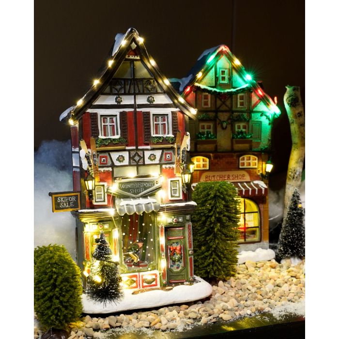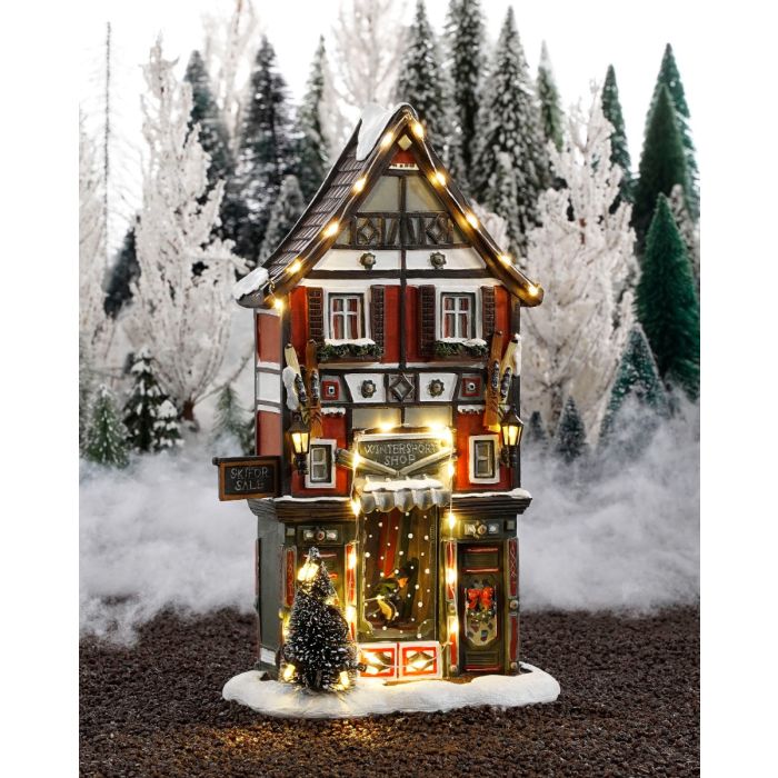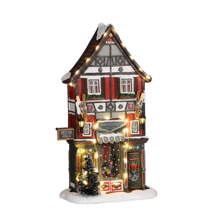 Smalt byhus i hollandsk stil med fint bindingsværk. I stueetagen er byens vintersportsbutik med højt udstillingsvindue rammet ind med lyskæde med hvidt lys. Der er skodder ved vinduerne og grøn beplantning under. Huset er godt belyst med lyskæde langs taget, gammeldags lamper på facaden og lyskæde rundt om juletræet. En meget hyggelig bygning til bylivet i julebyen. Byhuset er en del af Luvilles nye serie af smalle byhuse. Du kan finde flere byhuse her.