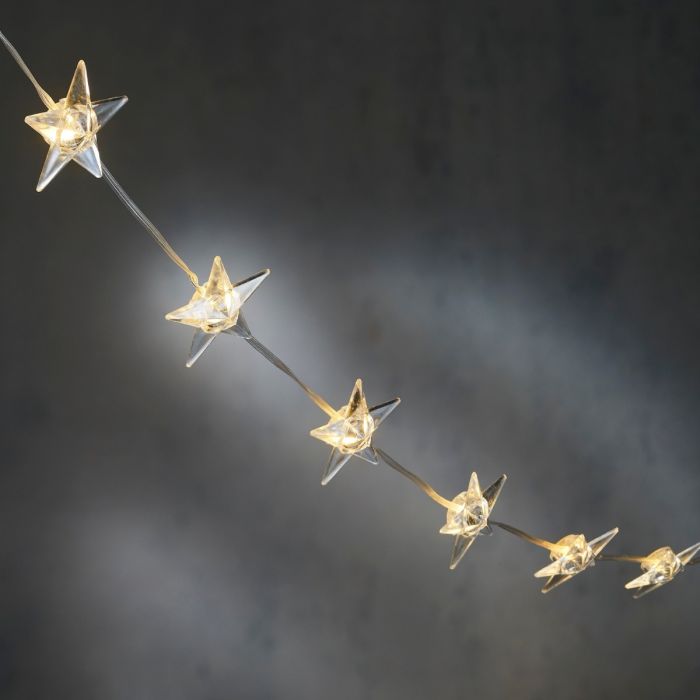 Lyskæde med 10 stjerner med klassisk hvidt lys. Lyskæden er med batteriboks med timer. Hyggelig belysning fx hen over julelandskabet eller i vinterdekorationer.