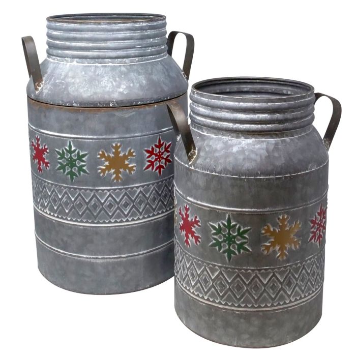 Mælkejunge i metal med snefnug. Sæt med 2 mælkejunger med mønster og farvede snefnug på.