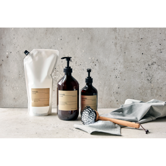 Sæben leveres i en elegant brun plastflaske med pumpe, der passer ind i både moderne og klassiske indretninger. Velegnet til daglig brug og alle hudtyper. Se flere Meraki Håndsæber her.