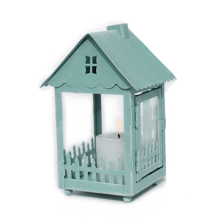 Forårsfriskt lanternehus i turkisblå metal med fine detaljer som glassider, lille dør og dekorativt stakit. Lyset fra et fyrfadslys eller et lille bloklys spreder en hyggelig glød gennem ruderne og gør lanternen oplagt til både vindueskarm, borddækning eller en lun plads i udestuen. Huset har et fint, næsten eventyrligt udtryk, der passer godt til forår og sommer. Bør stå inde eller under halvtag for at undgå rust.