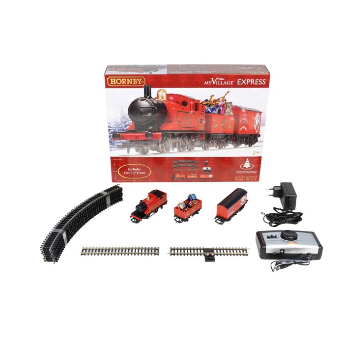 Der medfølger et lokomotiv, en lukket togvogn, en åben togvogn, buede skinner, lige skinner, fjernbetjening/controller og adapter.