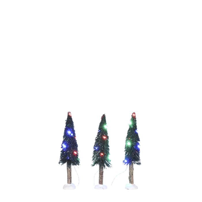 Dette er et sæt bestående af 3 nåletræer med høj, synlig stamme og med lys i forskellige farver.