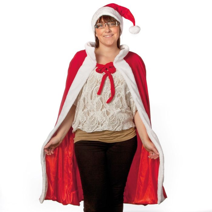 Rød nissekåbe med hvid kant og lille bindebånd. Kåben er i one-size. Der medfølger en nissehue, der matcher kåben.