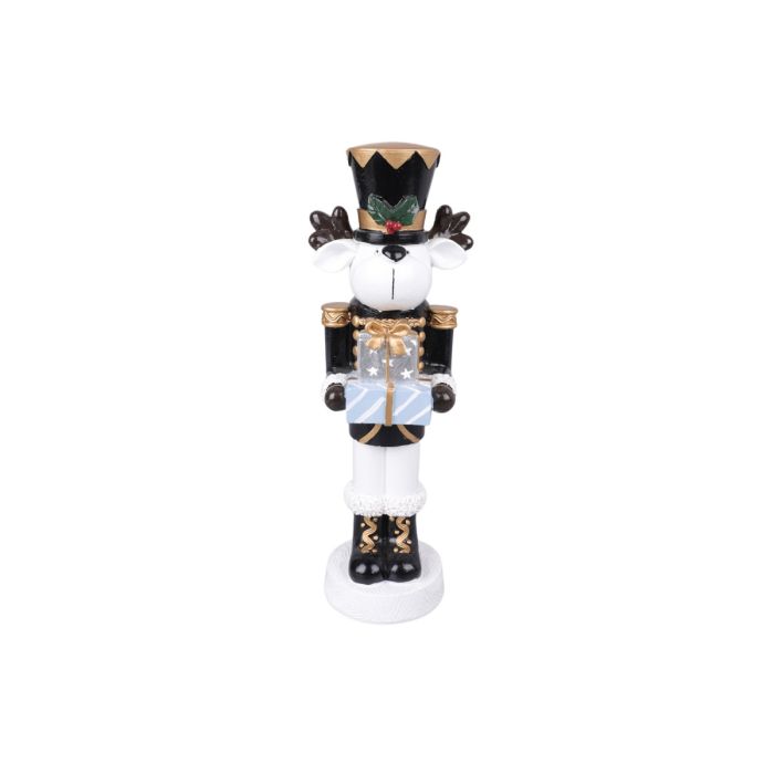 Nøddeknækker Soldat i hjorteudgave med gevir. Den er iført sort og hvid uniform med guldfarvede detaljer på. Hatten er pyntet med kristtorn og gaverne, den holder, er fint indpakkede.
