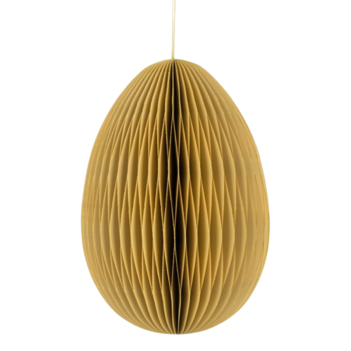 Påskeæg i papir lille gult. Påskeægget er fremstillet i genbrugspapir. Påskeægget foldes ud og lukkes med lille magnet. Måler 7 cm i højden