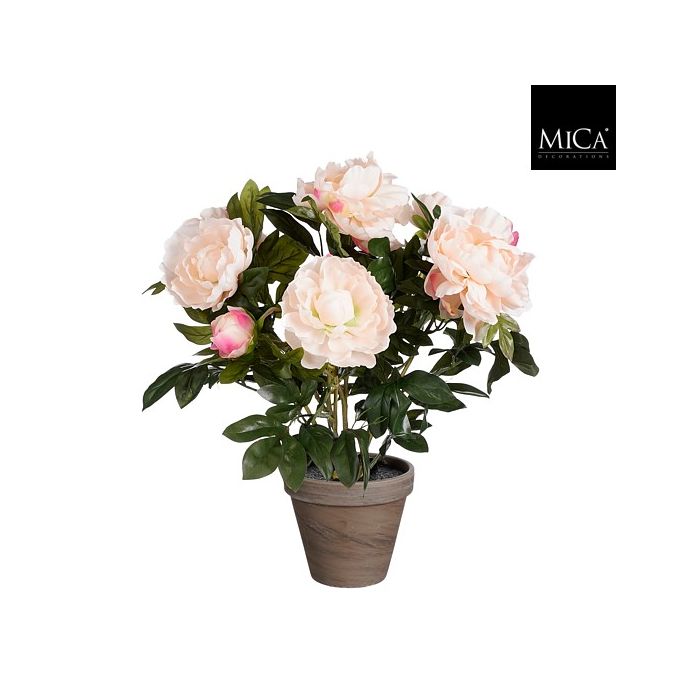 Høj, naturtro pæon med store laksefarvede blomster og mørkegrønne blade. Blomsten kommer i en dekorativ, grå lerpotte. Sæt fx den blomstrende sommerblomst på steder med stærk sol, hvor almindelige haveplanter, har det svært.