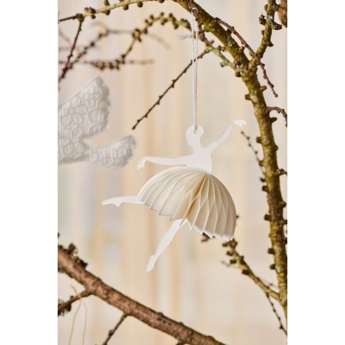 Elegant, dansende ballerina fra Ib Laursens julekollektion. Ballerinaen er med foldet papirskørt og dansende i smuk position. Der er snor i for let ophængning. Kan fx hænges på grene i en vase, på juletræet, i vinduet eller bruges liggende som bordpynt. Ballerinaens skørt foldes ud og lukkes ved hjælp af en magnet. Fås i forskellige positioner.