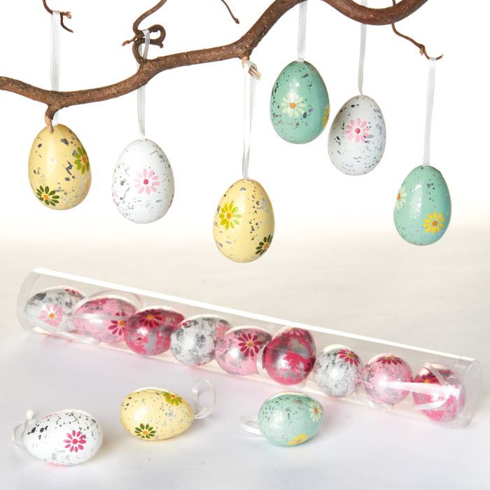 Æggene leveres i et sæt med ni styk samlet i et rør og er fremstillet i plast, hvilket gør dem velegnede til gentagen brug år efter år. En alsidig dekoration til dig, der ønsker påskeæg med et let, blomstret udtryk og mange anvendelsesmuligheder i forårsindretningen.