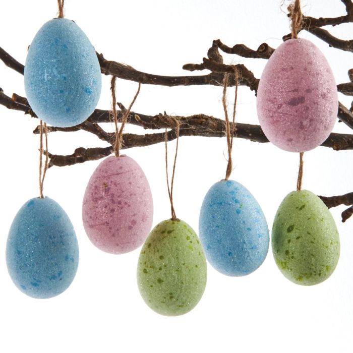 Disse hængeæg med glimmer tilfører påskens dekorationer et let og funklende udtryk, der fanger lyset og skaber liv omkring sig. Æggenes overflade er dækket af fint glimmer, som giver en diskret glans og fremhæver de bløde pastelfarver. Kombinationen af farve og struktur giver æggene et legende, men stadig roligt udtryk, som passer godt ind i forårets pynt.