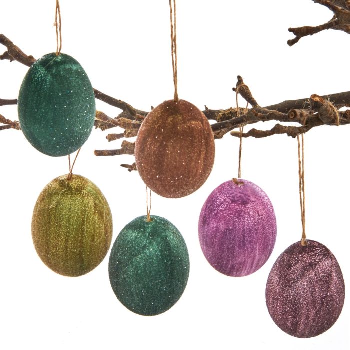 Æggene er forsynet med snor og kan hænges på grene i en vase, indgå i en ophængt dekoration eller bruges som en del af påskens bordpynt. De leveres i en æske med seks styk og er en stemningsfuld løsning til dig, der ønsker påskepynt med finesse, glans og klassiske forårsfarver.