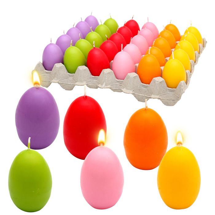 Påskeægslysene fås i seks forskellige farver, så du kan vælge netop den farve eller kombination, der passer bedst til din påskedækning eller forårsdekoration. De er dekorative både enkeltvis og samlet i en bakke, på et fad eller direkte på påskebordet, hvor de skaber en varm og indbydende stemning.