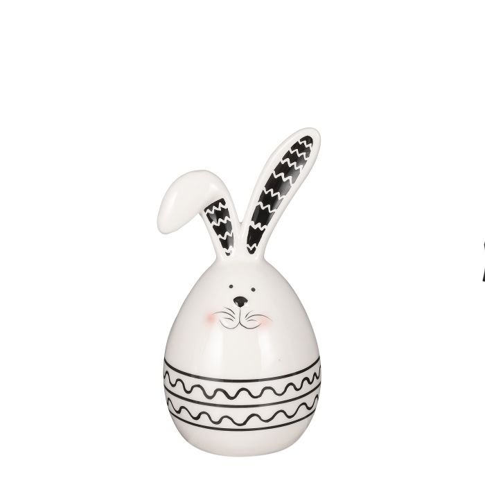 Grafisk og nuttet påskehare med æggeformet krop og lange, markante ører. Det enkle farvevalg i sort og hvid giver figuren et stilrent og moderne udtryk, mens de små rosa kinder tilfører et sødt og levende strejf.