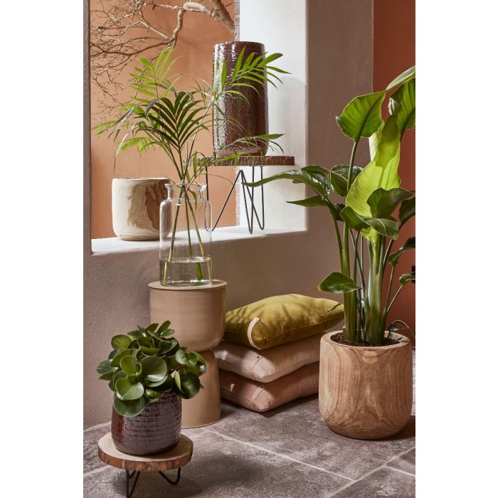Med sin generøse størrelse fungerer den som en dekorativ gulvurtepotte, der elegant løfter større grønne planter eller frodige, kunstige planter. Den varme naturtone giver en rolig og harmonisk stemning i indretningen og passer smukt ind i både moderne og nordiske hjem.