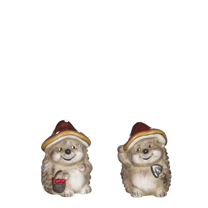 Søde pindsvin med små svampehatte i matte efterårsfarver. De skønne figurer har et glimt i øjet og et varmt smil, der straks skaber hygge i indretningen. Det ene pindsvin holder en lille graveske, mens det andet bærer en kurv med æbler, begge detaljer, der giver figurerne personlighed og et skønt skovtema. Perfekte som pynt i kurve og krukker, på en hylde eller i entreen, hvor de tilfører efteråret et legende og dekorativt udtryk. Fremstillet i polyresin med fine strukturdetaljer.