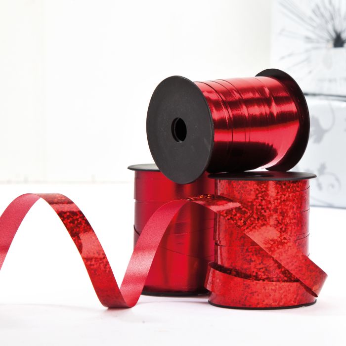 Rødt gavebånd i tre varianter i enten mat, blank eller med mønster. Gavebåndet måler 1 cm i bredden, og der er ti meter på en rulle.
