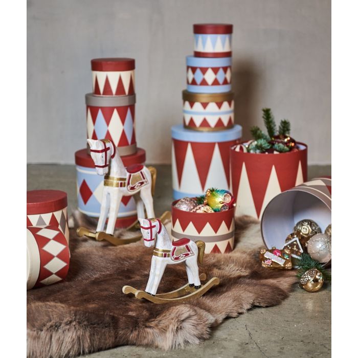Sæt med tre runde æsker i pap med flot mønster i farverne rød, offwhite og guld. Æskerne kommer i tre forskellige størrelser. Kan bruges til alt fra dekoration til opbevaring. Æskerne fra Speedtsberg er i god og kraftig kvalitet.