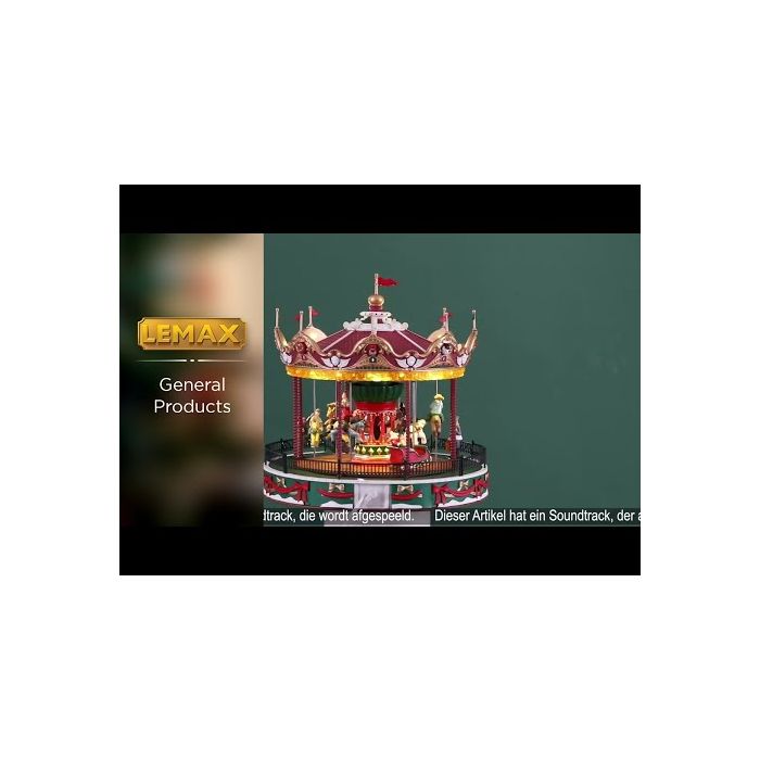 Julemandens karrusel med lys. En stor og flot karrusel med børn på rensdyr og isbjørne. Karussellen er pyntet med masser af sløjfer og flag. De mange figurer kører op og ned, hvilket giver en naturlig mekanisk lyd. Man kan derfor ikke forvente, at man ikke kan høre karrusellens mekanik. Der kan sættes musik på.