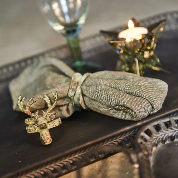 Servietring med rustikt udseende i antik grøn nuance. Praktisk til at holde styr på servietten og pynter flot og nemt i borddækningen. Kan både bruges til servietter af papir og stof.
