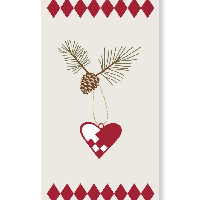 Moderne papirservietter til julebordet fra Speedtsberg. Servietterne er dekoreret med en grankvist med kogle og flethjerte samt dekorativ rødt mønster foroven og forneden. De passer godt til både julemiddage, adventshygge og årets festlige sammenkomster. Brug dem sammen med matchende juletekstiler og julepynt for at fuldende julelooket. Servietterne fås i flere designs.