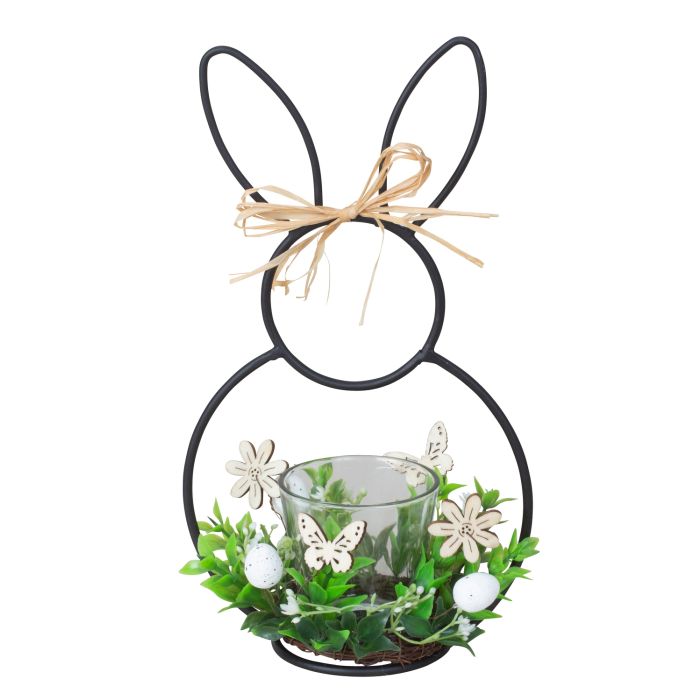Smuk fyrfadsstage i silhouetformet sort metal, udformet som en sød påskehare med fine, strittende ører og en lille naturfarvet sløjfe om halsen. I bunden står et glas til fyrfadslys omkranset af en dekorativ lille rede af grønne blade, forårsblomster, små æg og lette sommerfugle, som giver et friskt og livligt udtryk. En sød forårsdekoration, der skaber varm hygge på påskebordet, i vinduet eller på en hylde. Måler 25 cm i højden.