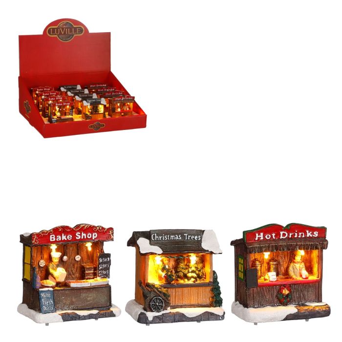 Små, stemningsfulde markedsboder fra Luville Specials, der bringer liv og hygge ind i julebyen. Hver bod er rigt dekoreret med sne, fine detaljer og varmt indbydende lys, som straks skaber en autentisk markedsgade i dit julelandskab. De små boder forestiller klassiske julemarkedsstemninger som friskbagte lækkerier, duftende grantræer eller varme drikke, og de passer smukt ind både som hel lille markedsplads eller blandet med andre bymiljøer. Med en højde på ca. 10 cm er de oplagte til både julelandskab, juleby eller vinterdekorationer, hvor de spreder en varm og hyggelig glød i vintermørket.