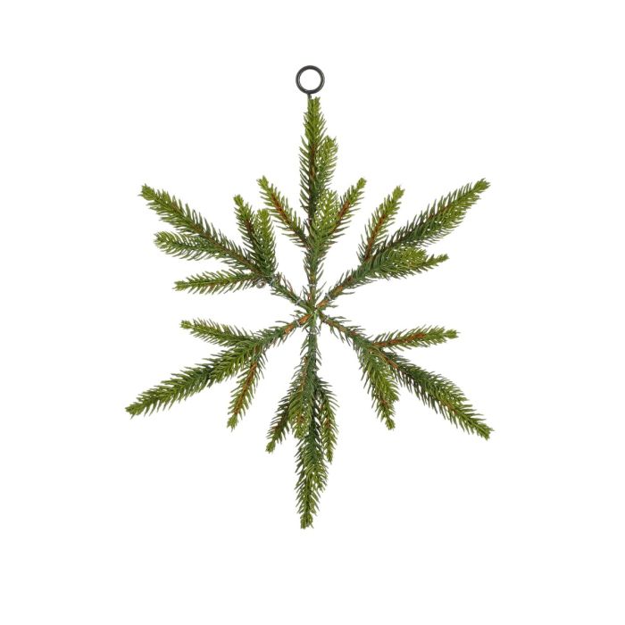 Ophæng formet som et stort snefnug i grøn kunstgran. Kan pynte både inde i fx vinduer eller ude som pynt på låger. Fås i flere farver.