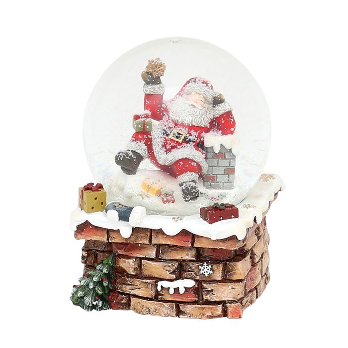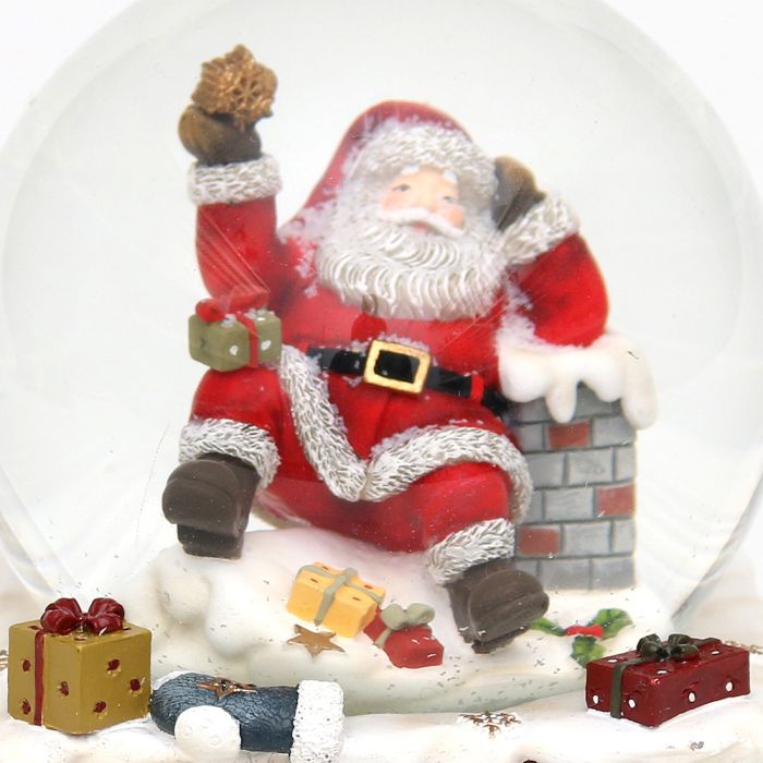 Snekugle med julemand på skorsten. Den er lavet af polyresin, og kuglen er af glas. Snekuglen kan spille musik. Melodien er "We wish you a merry Christmas".