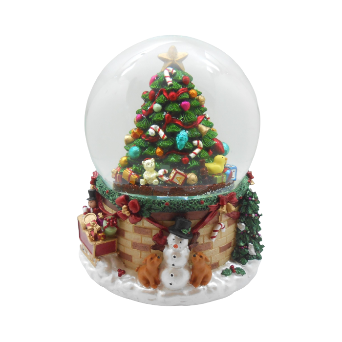 Snekugle Juletræ med pynt. I snekuglen er der et pyntet juletræ. Kuglens sokkel er en pyntet mur. Tændes den batteridrevne (batterier ikke inkluderet) snekugle, blæser sneen automatisk rundt, der kommer lys i kuglen, og melodien "Oh Christmas tree" spiller.