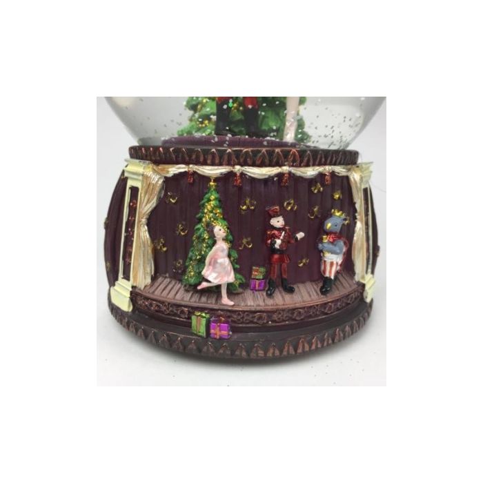 Snekugle Nøddeknækkeren. Snekugle med juletræ og figurer fra Nøddeknækkeren. På snekuglens sokkel er der ligeledes en scene med motiv fra Nøddeknækkeren.