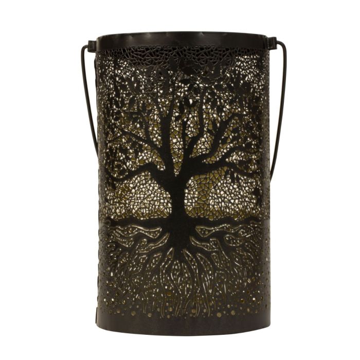 Solcelledrevet lanterne i sort metal med hulmønster, der danner flotte skygger af livets træ. Lanternen lyser ca. 7-8 timer af gangen. Perfekt som hyggebelysning om sommeren i haven.