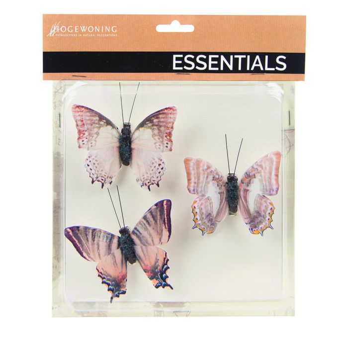 Dekorative sommerfugle i lyse nuancer med klips under. Kan nemt sættes fast på grene, pakker, kranse mv.