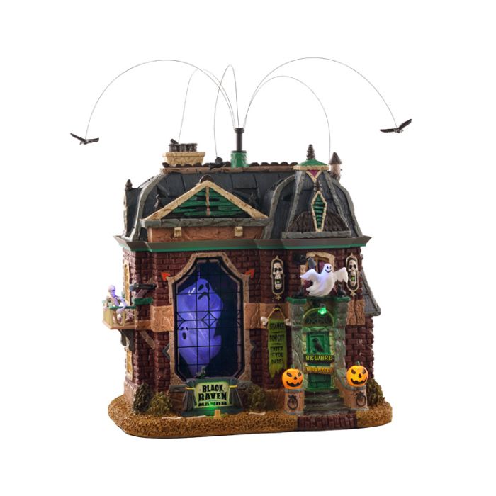 Sort ravns herregård. Stor og uhyggelig gård med et flot lilla lys i vinduet og højtflyvende kraver. Facaden har både spøgelse og græskar.