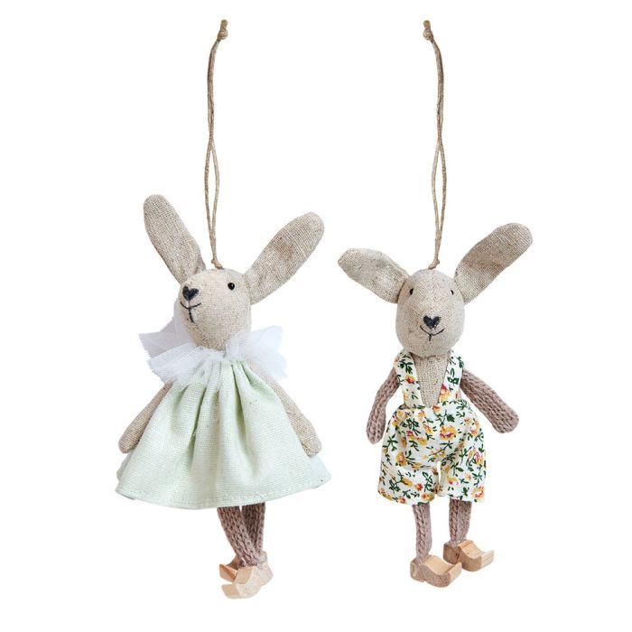 Den ene påskehare er klædt i en enkel og let kjole, som giver et luftigt forårslook, mens den anden har et mere farverigt og mønstret outfit, der skaber liv og spil i dekorationen. Sammen giver de en skøn kontrast, og hver figur har sin egen lille personlighed, som gør dem oplagte at bruge både samlet eller hver for sig.