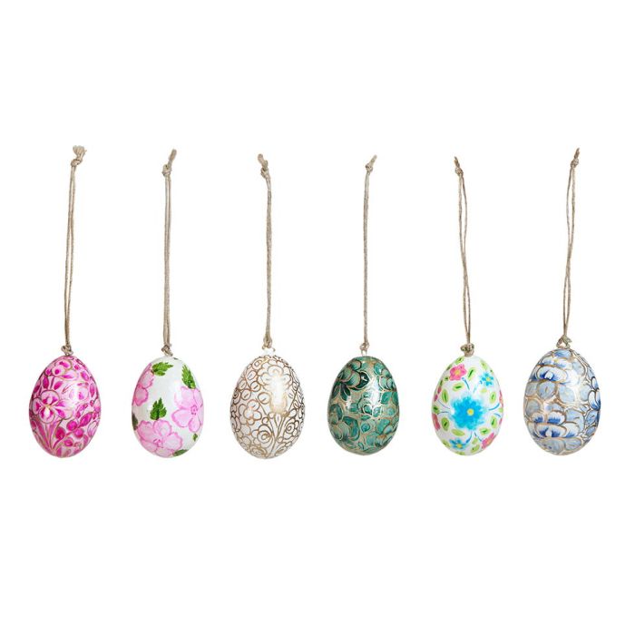 Påskeæggene kan hænges på grene, hvor de skaber let bevægelse og blikfang, eller bruges som en del af bordpynten til påskefrokosten. De fungerer både enkeltvis og samlet, hvor de forskellige mønstre spiller sammen og giver dekorationen dybde. Det gør dem velegnede til både klassiske påskeopstillinger og mere personlige sammensætninger.