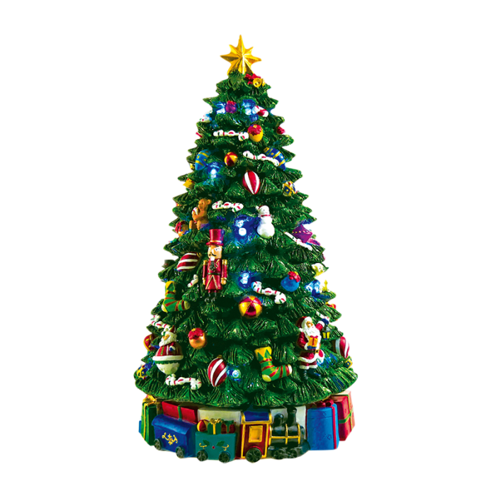 Spilledåse Juletræ med pynt. Dette juletræ er pyntet fra top til bund efter alle julens regler. Juletræet drejer rundt og de små pærer lyser juletræet op. Der er mulighed for afspilning af 8 forskellige julemelodier.