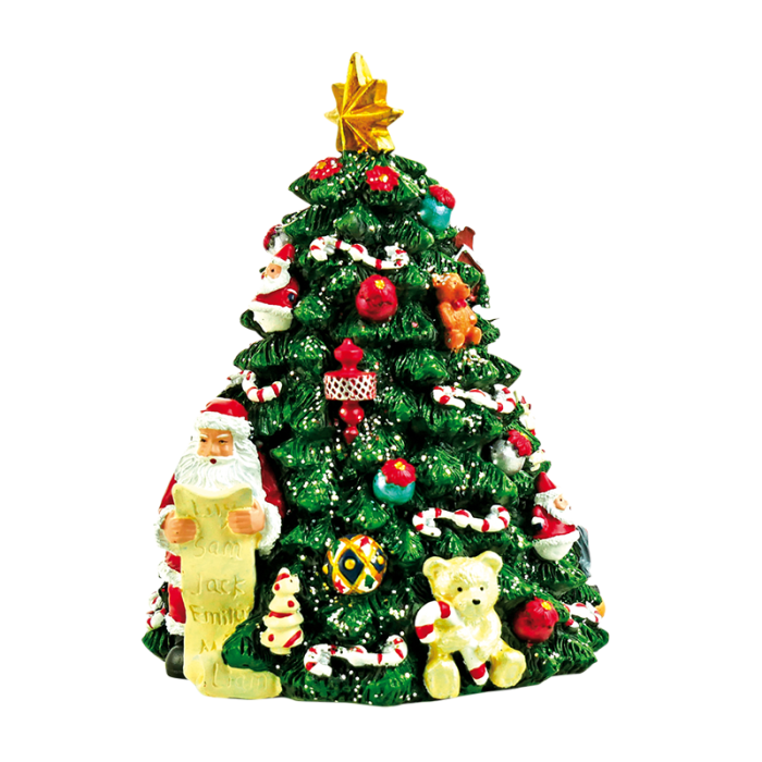 Overdådigt pyntet juletræ med julestokke, julekugler, bamser, julemænd mv. En stor bamse med slikstok springer i øjnene siddende for foden af træet, og julemanden står med den lange, lange ønskeliste. Spilledåsen kan trækkes op, og juletræet drejer rundt til melodien: "O Christmas Tree".