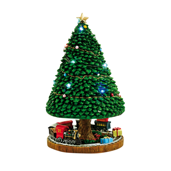 Tæt, bredt juletræ med enkel guirlande og farvede LED-lys på. Juletræet er opstammet og rundt om stammen, er der et lille tog og pakker på skinnerne. Spilledåsen kan trækkes op, og juletræet drejer rundt til melodien: "O Christmas Tree".