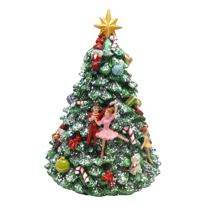 Spilledåse Juletræ med nøddeknækker. Flot juletræ pyntet med nøddeknækker og ballerina. Når juletræets mekaniske spilledåse trækkes op, drejer træet rundt og melodien "O Christmas tree" spiller.