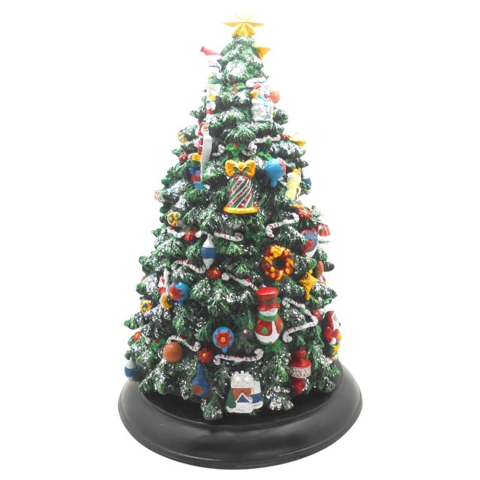 Et meget detaljeret og rigt pyntet juletræ, som står på en mørkebrun bund. Rundt omkring på træet sidder flerfarvede LED-pærer, der tænder skiftevis og skaber liv og bevægelse. Juletræet drejer roligt rundt og kan spille 8 forskellige julemelodier, som fuldender den hyggelige julestemning.