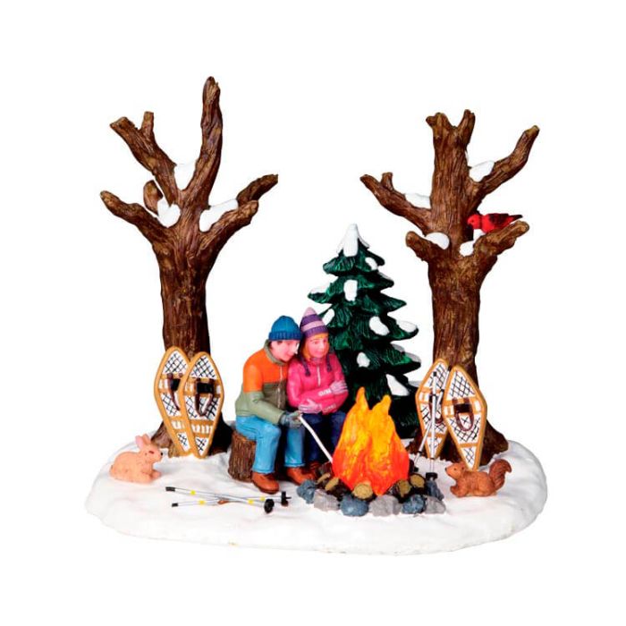 Par holder sig varme i sneen. Der er lys i flammerne.
