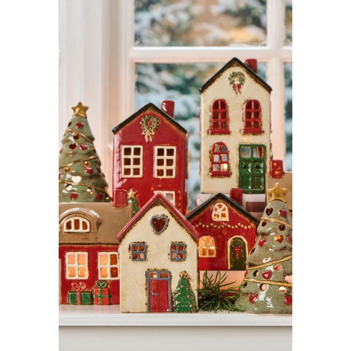 Idyllisk og julet keramikhus fra Ib Laursens populære Stillenat-serie. Huset er beige med rødt tag og dekorative detaljer som fx det hjerteformede, grå vindue i kvisten. Når du placerer et fyrfadslys eller en lyskæde indeni, strømmer lyset stemningsfuldt ud gennem de små vinduer og spreder et hyggeligt skær. Den særlige glasur giver hvert hus et unikt og levende udtryk, så ingen huse er helt ens. Brug huset alene som en dekorativ detalje eller kombiner flere og skab din egen lille juleby fuld af magisk julestemning.