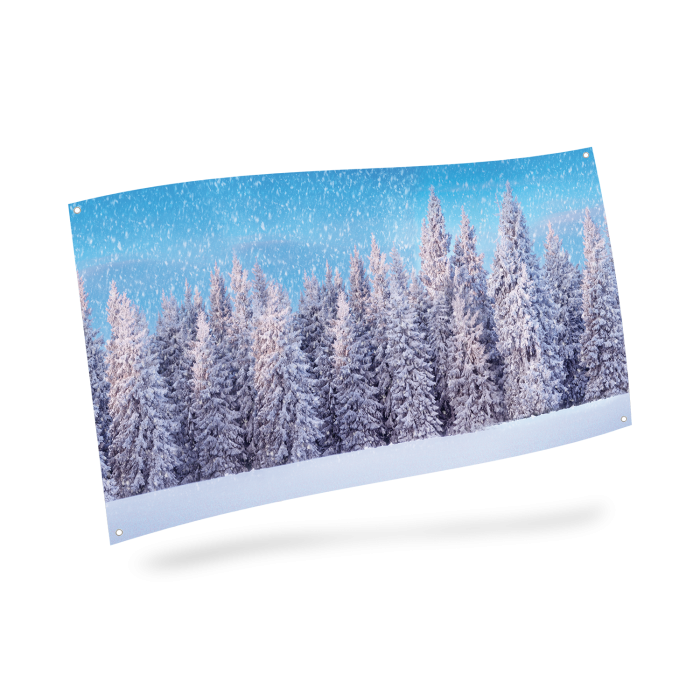 Stor baggrund med snedækket skov er fremstillet i stof og er meget nem at hænge op.