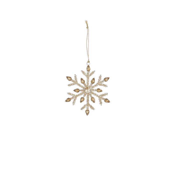 Dekorativt snefnug med glimtende perler i champagne- og guldfarvet. Hænges fx på grangrene eller som pynt i små vinduer.
