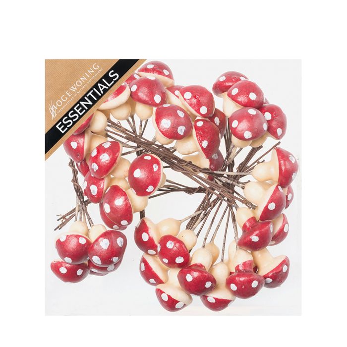 Svampe med wire. Svampene er røde med hvide pletter. De sidder på en lille metalwire som stilk. Der er 8 klynger med 6 svampe i æsken i alt 48 stk.