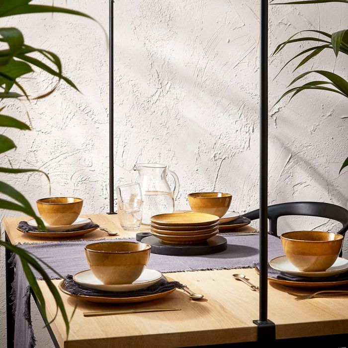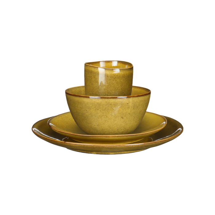 Tabo spisestel med 16 dele til 4 personer i flot okker farve fra Mica Decorations. Håndlavet keramikstel, hvor ingen dele er helt magen til hinanden. Robust spisestel med flotte, rustikke overflader. Sættet består af 4 middagstallerkner, 4 frokosttallerkner, 4 skåle og 4 krus.