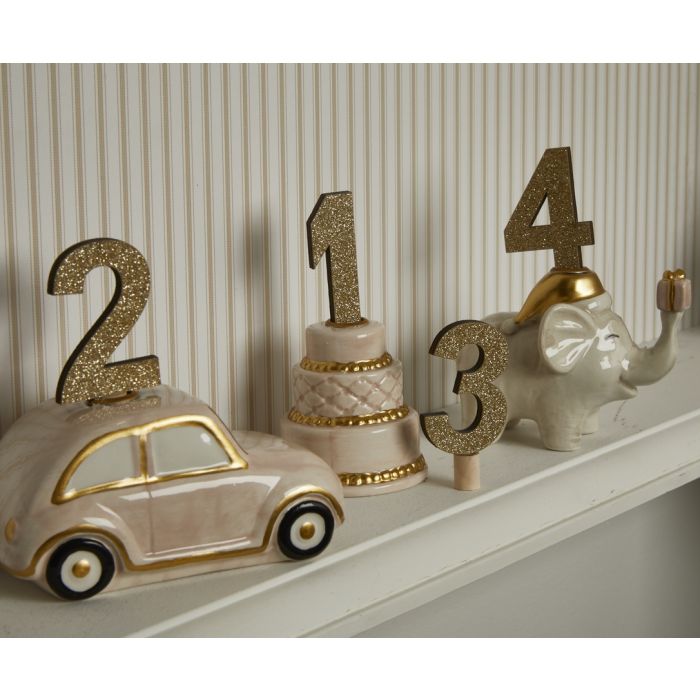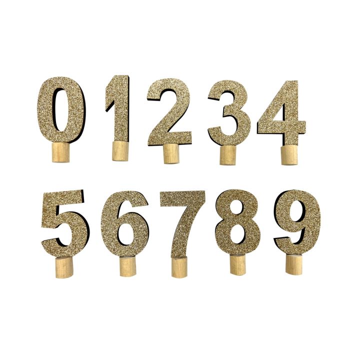 Festlige guldglitterfarvede tal i træ med lille "dut", der passer ned i alle de skønne lysestager til kertelys fra Speedtsberg. Der er 10 tal med numrene fra 0-9 i en pose.